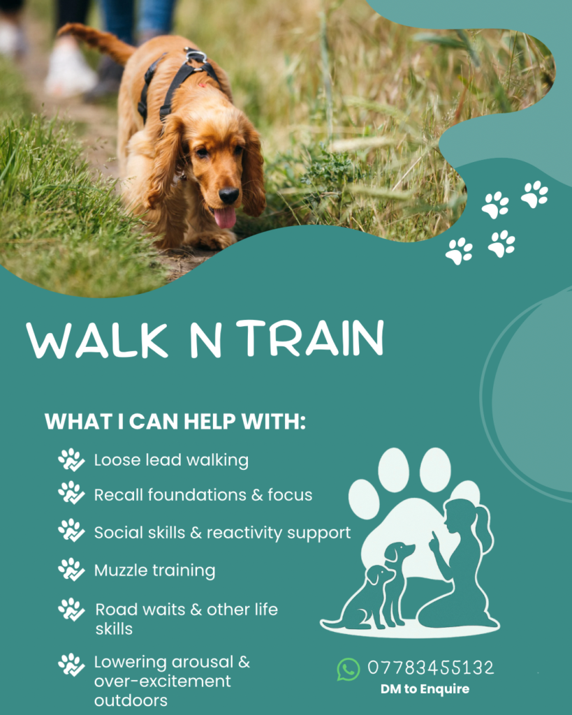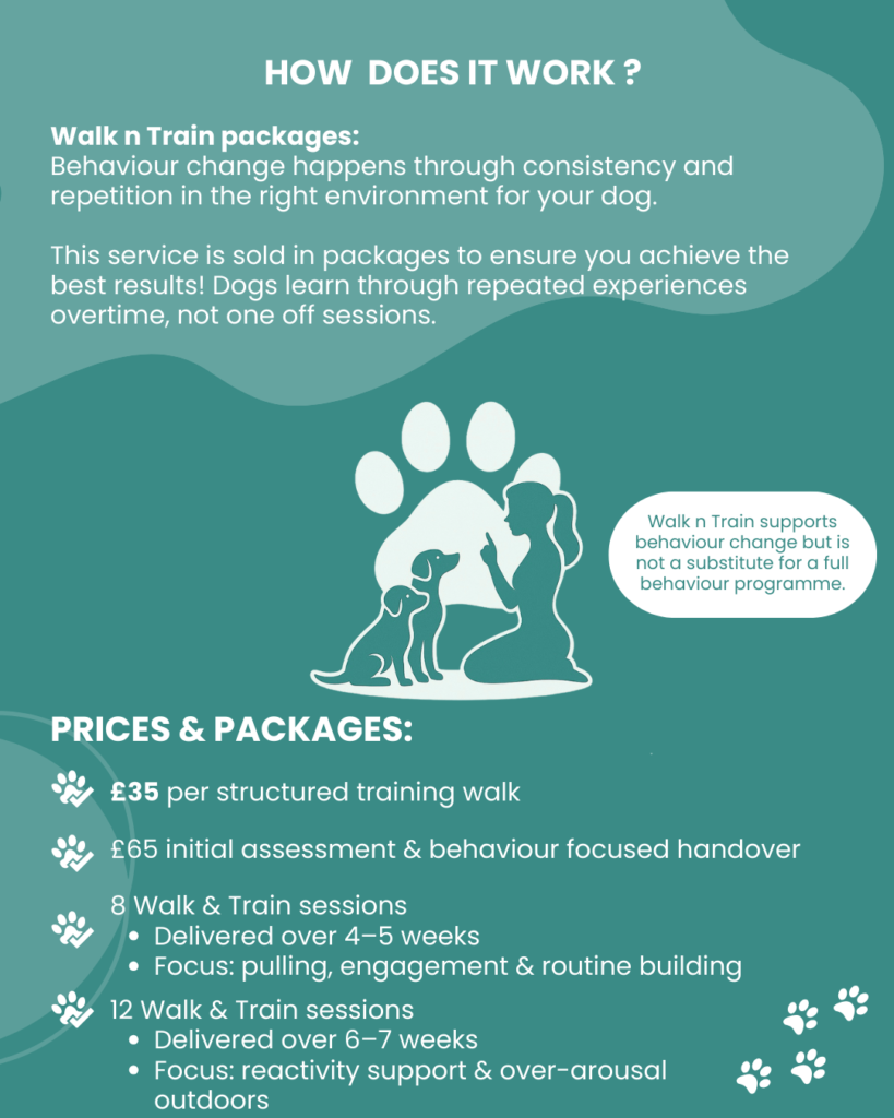 Walk n Train is a structured training service designed to support behaviour change through consistency, repetition and real-life practice. This service focuses on skill-building, emotional regulation and reducing the rehearsal of unwanted behaviours during everyday walks.